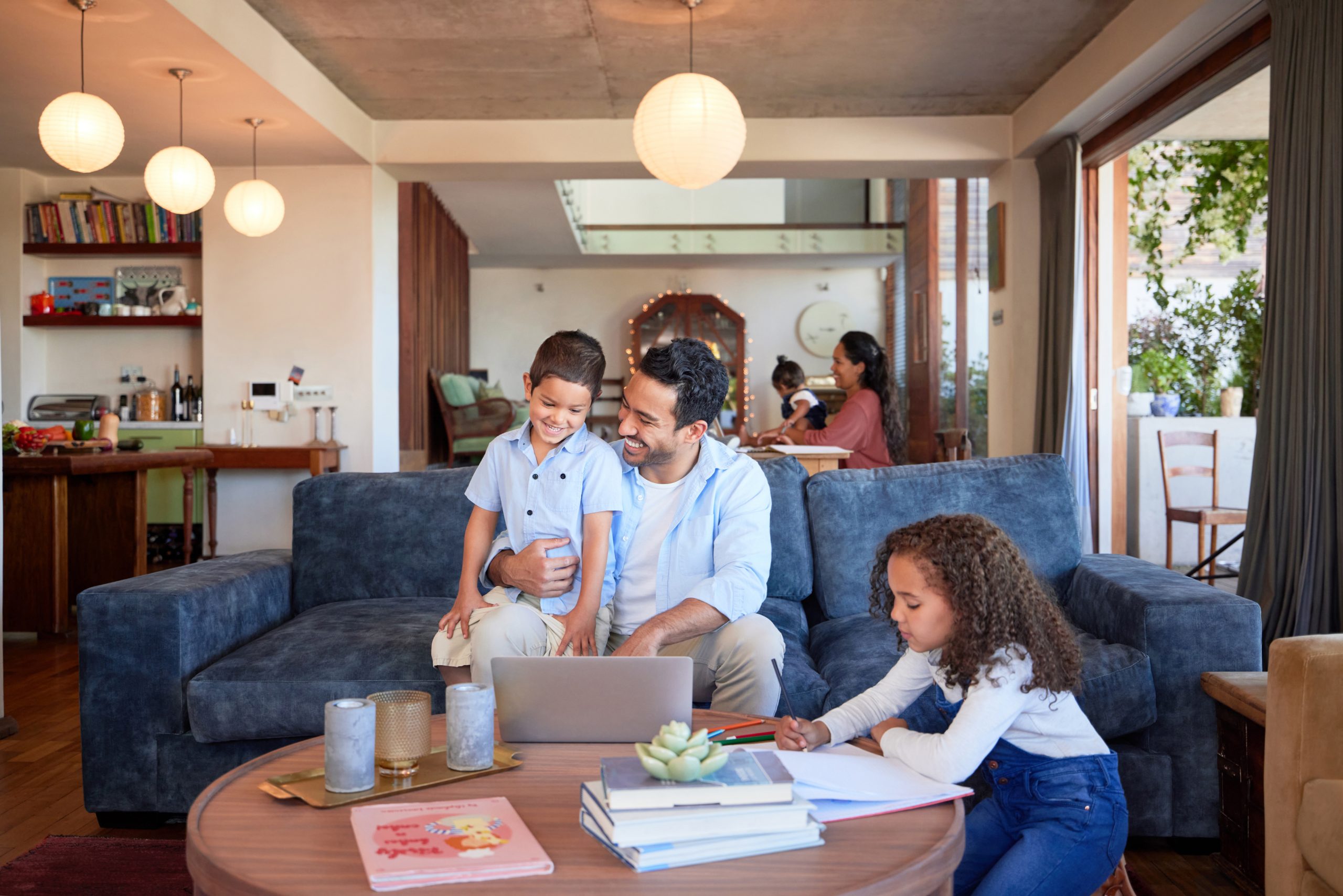 - dad-laptop-kid-couch-e-learning-streaming-online-video-education-children-father-girl-technology-lounge-home-teaching-studying-happy-together-morning