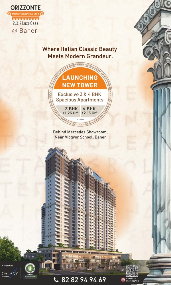 Orizzonte by Galaxy Ventures is an exclusive residential project offering spacious 3 BHK flats and premium 4 BHK flats in Baner, Pune. Designed for luxurious living, each home offers smart layouts, modern finishes, and a vibrant lifestyle. Located in one of Pune’s most sought-after locales, Galaxy Orizzonte is RERA registered (P52100054519) with possession slated for December 2027.